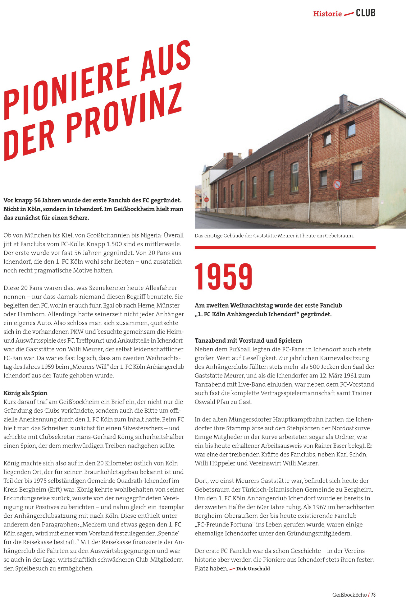 Am 2. Weihnachtstag 1959 wurde der erste Fan-Club des 1. FC Köln in der Gaststätte Meurer, heute Gebetshaus der Türkisch-Islamischen Gemeinde, gegründet. Kurz nach der Gründung beantragte man beim FC die offizielle Anerkennung des Fan-Clubs mit dem Namen: 1. FC Anhängerclub Ichendorf. In der strengen Vereinssatzung hieß es u.a. „Meckern und etwas gegen den FC sagen wird mit einer vom Vorstand festzulegenden Spende für die Reisekasse bestraft.“ Kurzum wurde der Clubsekretär des FC Köln, Hans-Gerhard König, nach Ichendorf geschickt, um das Ansinnen der FC-Fans zu prüfen. Da alles mit rechten